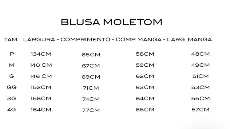 Modelagem mais ampla sem capuz com manga raglã e gola de 5cm de largura.